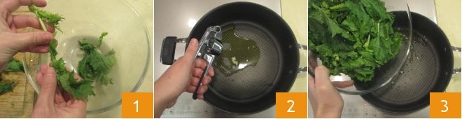 Para preparar as orecchiette verdes, a primeira coisa a fazer é limpar as cime di rapa: para esta receita você só precisará das folhas e inflorescências, então separe-as dos talos 1 e lave-as sob água corrente. Adicione um fio de óleo em uma panela, esmague um dente de alho 2 e deixe dar sabor brevemente, depois adicione as cime di rapa 3.