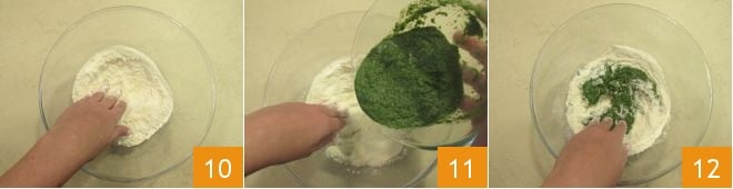Nesse ponto, coloque a sêmola em uma tigela e forme uma fonte 10, despeje no centro o purê de cime di rapa 11 e trabalhe com as pontas dos dedos para incorporá-lo 12.