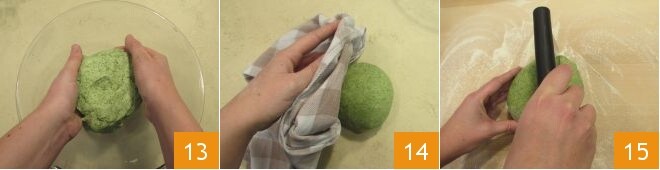 Uma vez bem misturado 13, transfira a massa para uma superfície e continue trabalhando até que fique bem firme e elástica, depois cubra com um pano 14 e deixe descansar em temperatura ambiente por cerca de 15 minutos. Após o tempo de descanso, pegue uma porção de massa 15 e mantenha coberto o restante, para que não seque.