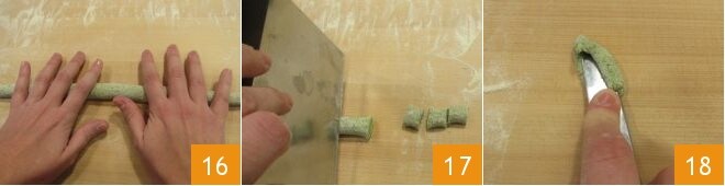 Enfarinhe levemente a superfície e trabalhe a porção de massa com ambas as mãos para dar a forma de um rolinho de cerca de 1 cm de espessura 16, depois corte em pedaços do mesmo tamanho 17. Pegue um pedacinho de cada vez e aperte-o com uma faca de lâmina lisa, ao mesmo tempo puxando-o em sua direção 18.