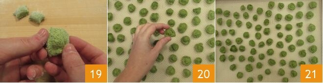 Vire a conchinha sobre si mesma 19 e você terá a sua primeira orecchietta! Continue dessa forma para formar todas as orecchiette até acabar a massa, posicionando-as aos poucos em uma rede de secagem ou em uma tábua 20. Depois de formá-las 21, cubra com um pano leve que permita a passagem de ar e deixe secar durante a noite, depois suas orecchiette verdes estarão prontas para serem embaladas e presenteadas!