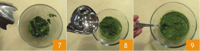 Quando as cime di rapa estiverem macias, transfira-as para um recipiente alto e estreito 7 e adicione um pouco de água até atingir um peso total de 280 g 8, depois bata com um mixer de mão para obter um purê bastante líquido 9.