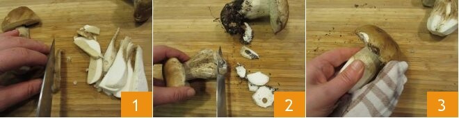 Para preparar o orzotto com cogumelos e maçãs, prepare o caldo de legumes, que você precisará manter quente para usar na cozedura do orzotto. Em seguida, passe para a limpeza dos cogumelos: remova a base do talo 1, limpe a superfície com um pano para remover resíduos de terra 2, depois corte-os em fatias no sentido longitudinal 3. Reserve-os e prossiga com a receita.
