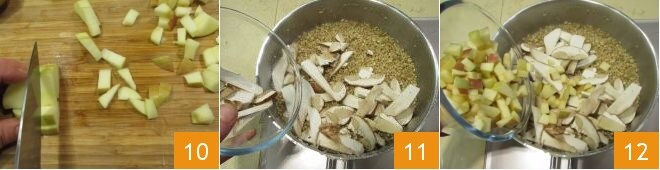 então, sem descascá-las, corte-as em pequenos cubos 10. Na metade do cozimento do orzotto (após cerca de 10 minutos) adicione os cogumelos porcini 11 e as maçãs em cubos 12