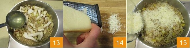 Continue cozinhando por mais 10 minutos, adicionando sempre o caldo aos poucos 13. Rale o Pecorino semi-curado 14 e quando o orzotto estiver cozido, desligue o fogo e finalize com o queijo ralado 15.