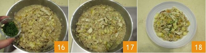 Para finalizar, aromatize com a salsa fresca picada 16, misture para dar sabor 17 e sirva imediatamente o orzotto com cogumelos e maçãs bem quente 18!