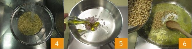 Enxágue a cevada em água corrente 4, e depois deixe escorrer em uma peneira. Descasque e pique a chalota, depois coloque um fio de azeite em uma panela, adicione a chalota picada 5 e refogue em fogo moderado até que fique translúcida. Neste ponto, adicione a cevada 6 e toste por um minuto,