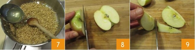 então regue com uma concha de caldo 7, adicione sal, pimenta e continue cozinhando por cerca de 20 minutos como se fosse um risoto, adicionando o caldo aos poucos conforme necessário, mexendo de vez em quando. Enquanto o orzotto cozinha, cuide das maçãs: lave-as e seque-as, depois divida-as primeiro ao meio 8 e depois em 4 gomos. Corte fora a parte central do caroço dos gomos 9,