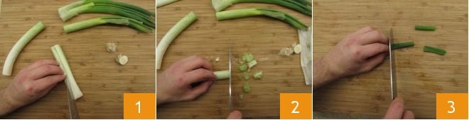 Para preparar as ostras com espumante e cebolinha, comece pela limpeza das cebolinhas. Corte e elimine a parte inferior e depois o topo, cortando onde há a junção entre a parte verde (não a descarte), que é mais dura, e a parte branca, onde começa a parte mais macia. Corte verticalmente esta última e elimine a película; se necessário, lave o interior 1. Por fim, pique finamente e coloque em uma tigela 2. Enquanto isso, limpe os talos da cebolinha que você reservou. Em seguida, corte em pedaços de 3-4 cm 3.