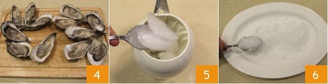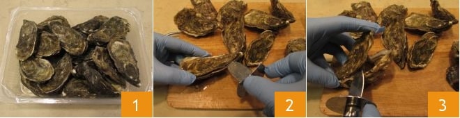 Para preparar as ostras limão e pimenta, certifique-se de que as conchas das ostras estejam fechadas 1, depois abra as ostras. Essa é uma operação muito delicada, equipe-se com a faca apropriada com ponta fina, a proteção no cabo para proteger os dedos e uma pegada firme. Com uma mão mantenha a ostra bem firme e com a outra segure a faquinha e procure a abertura (se quiser, pode pedir na peixaria as ostras já perfuradas para uma abertura facilitada) insira a lâmina e corte o músculo que se encontra na parte central 2, depois de cortá-lo, será mais fácil seguir a circunferência abrindo a ostra por completo 3.