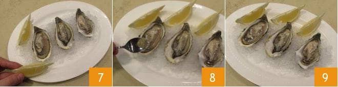 Coloque as ostras sobre o gelo junto com os gomos de limão 7 e sirva. Cada convidado irá temperar na hora com suco de limão e pimenta a gosto (8-9).