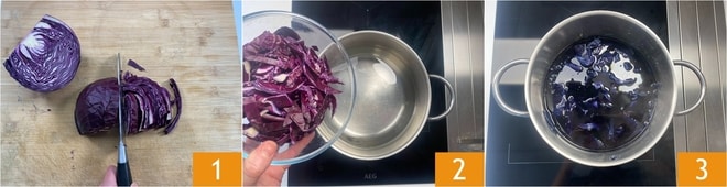 Para preparar os ovos coloridos recheados, comece fazendo os purês. Corte o repolho 1, mergulhe-o em água fervente salgada 2 e deixe cozinhar por cerca de 30 minutos 3.
