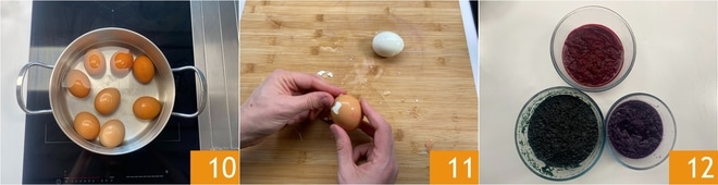 Em seguida, passe para os ovos. Coloque-os em uma panela e cubra com água fria 10. Acenda o fogo e conte 9 minutos a partir da primeira fervura. Mantenha o fogo baixo para não quebrar os ovos, depois escorra-os delicadamente e resfrie-os em água fria. Bata a casca no local onde está a pequena câmara de ar na base e descasque-os bem delicadamente 11. Tente não quebrar os ovos, é importante que fiquem lisos. Recolha os 3 purês.