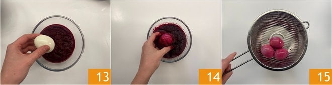 Imersa os ovos no interior 13, de modo que fiquem completamente cobertos pelo purê. Cubra com filme plástico para alimentos 14 e coloque na geladeira durante toda a noite. Em seguida, retire os ovos do purê 14 e enxágue rapidamente 15.