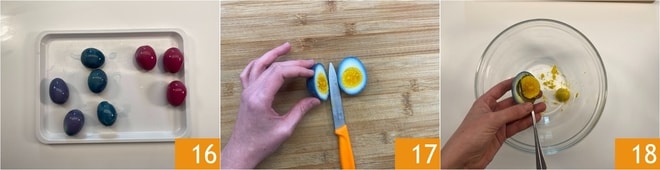 À medida que coloca os ovos em uma bandeja 16, sem aproximá-los muito. Considere que ainda tenderão a soltar um pouco de cor. Divida os ovos ao meio 17, retire a gema com uma colher e transfira-as para uma tigela 18.