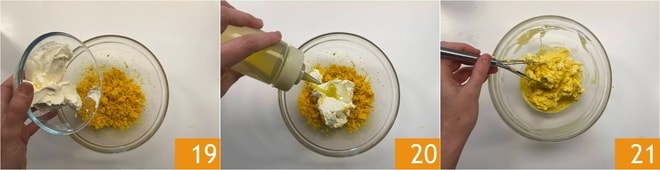 Salgue, adicione pimenta e o queijo cremoso 19. Despeje o óleo 20 e misture bem com um batedor 21.