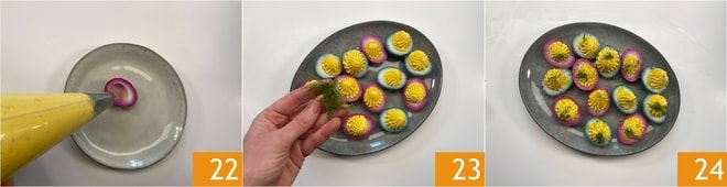 Transfira a mistura para um saco de confeitar com bico frisado e recheie seus ovos coloridos recheados 22. Decore com erva-doce 23 e adicione ainda uma pitada de sal, pimenta e um fio de óleo 24.