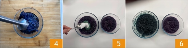 Depois, escorra e bata com um mixer de imersão para obter um purê 4. Divida o purê em 2 tigelas e em uma delas adicione um pouco de bicarbonato para tornar a cor mais azul 5. Misture bem 6.