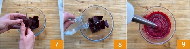 Para fazer a cor rosa, corte a beterraba em cubos em uma tigela 7; adicione um pouco de água 8 e bata com um mixer de imersão para obter um purê 9. Se necessário, adicione mais um pouco de água.