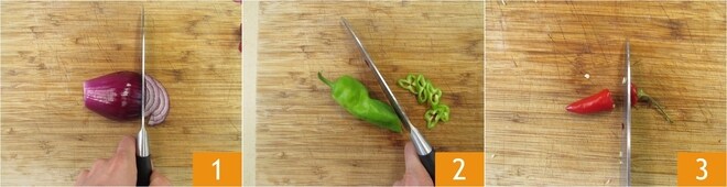 Para preparar os ovos endiabrados, a primeira coisa é cortar a cebola em fatias finas 1. Depois corte também o pimentão em rodelas 2 e a pimenta em pedaços 3.