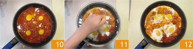 Continue rapidamente até adicionar todos os 4 ovos 10. Cubra com uma tampa 11 e cozinhe por cerca de 5 minutos. A clara deve estar cozida, enquanto a gema deve estar mole. Sirva os ovos bem quentes, adicionando uma pitada de sal em cada um 15.