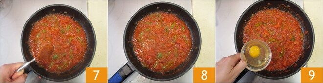 Adicione a 'nduja 7 e misture até que esteja bem derretida no molho 8. Quebre os ovos um a um, para facilitar, quebre-os numa tigelinha, assim será mais fácil despejá-los na frigideira 9.