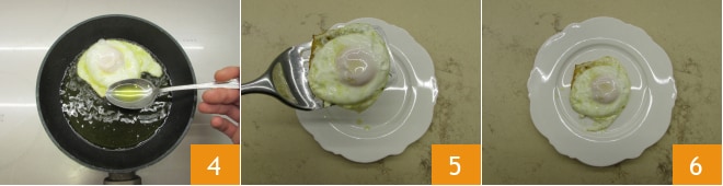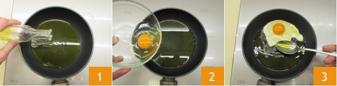 Para preparar os ovos fritos, recomendamos usar uma frigideira antiaderente, despeje o óleo até cobrir todo o fundo 1. Aqueça-o e depois adicione um ovo quebrando-o em uma tigela 2. Cozinhe em fogo médio-alto inclinando ocasionalmente a frigideira para recolher o óleo com uma colher e regar a superfície 3.