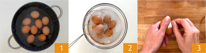 Para preparar os ovos gratinados, primeiro cozinhe os ovos em água abundante 1 e deixe cozinhar por 8 minutos a partir do momento da fervura. Após esse tempo, mergulhe os ovos em água bem fria 2 e depois descasque-os 3.