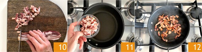 Corte o bacon defumado em cubinhos 10 e deixe dourar em uma frigideira antiaderente 11 até ficar bem crocante 12.