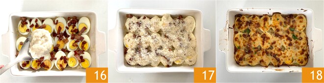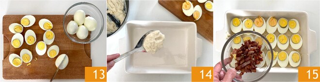 Corte os ovos ao meio 13. Despeje metade do molho bechamel no fundo da travessa 14 e disponha os ovos na travessa, um ao lado do outro. Adicione os cubinhos de bacon 15.