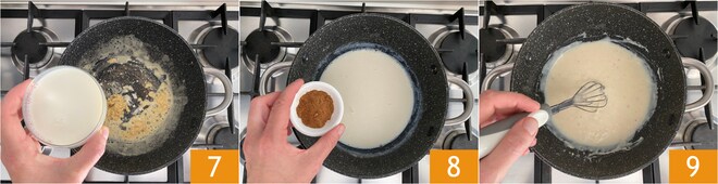 e logo depois o leite em fio 7, mexendo com um batedor para evitar a formação de grumos. Tempere com noz-moscada 8, sal e pimenta-do-reino e cozinhe em fogo baixo até engrossar, depois desligue o fogo 9.