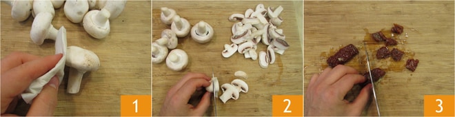 Para preparar os ovos estrelados com cogumelos e tomates, comece pela limpeza dos cogumelos: depois de cortar a parte terrosa da base, raspe o chapéu com papel de cozinha 1 ou um pano umedecido. Corte em fatias finas de meio centímetro 2. Corte os tomates secos escorridos do óleo de conservação em 2-3 pedaços 3.