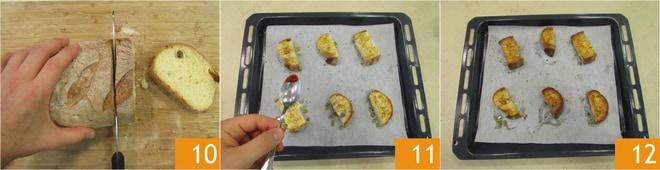 Enquanto os cogumelos cozinham, fatie o pão 10, coloque em uma assadeira com papel manteiga e espalhe na superfície óleo, sal, pimenta e uma pitada de páprica defumada 11 e toste no forno quente a 200°, na parte superior (não em contato com a resistência) por cerca de 5-6 minutos 12.