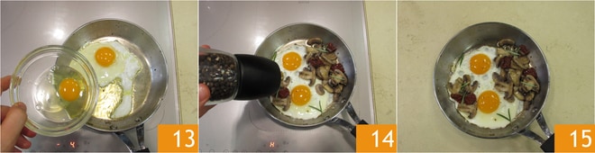 Quando tudo estiver pronto, cuide do cozimento dos ovos: na frigideira com o fundo, quebre dois ovos 13, se preferir, faça isso em uma tigelinha para não romper a gema. Cozinhe pelo tempo que achar adequado (cerca de 3-4 minutos no máximo, tempo suficiente para a clara firmar e a gema ficar cremosa o bastante). Quando a clara estiver consistente, adicione a guarnição na frigideira, apimente 14, salgue e, por fim, desfrute imediatamente dos ovos estrelados com cogumelos e tomates acompanhados do pão tostado 15.