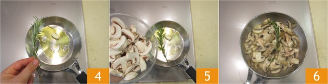 Em uma frigideira com óleo, aqueça o alho e o alecrim 4. Em seguida, adicione os cogumelos 5 e, após uma rápida fritada, salgue, de modo que a água de vegetação seja liberada. Assim que essa água estiver quase totalmente evaporada 6