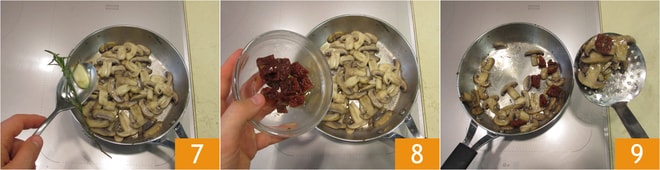 remova o alho e o alecrim 7, adicione os tomates secos 8 e salteie brevemente; reserve os cogumelos 9 e deixe o fundo na frigideira.