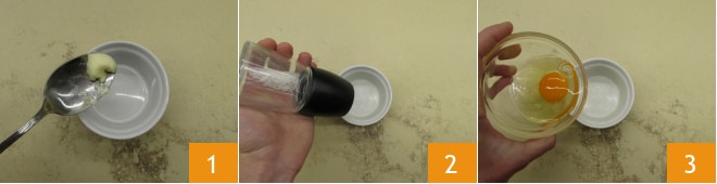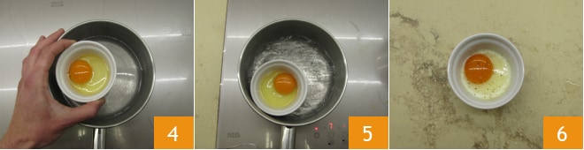 Para preparar os ovos no cocotte, comece untando uma cocotte com diâmetro de 9 cm 1. Salgue 2 e despeje os ovos à temperatura ambiente, um de cada vez, previamente quebrados em uma tigela ou pratinho 3.