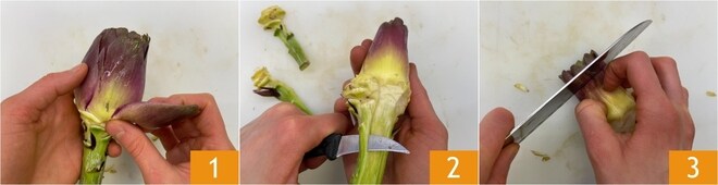 Para preparar os paccheri com alcachofras, vôngoles e bottarga, primeiro deixe os vôngoles de molho em uma tigela com água salgada por algumas horas. Passe para a Como limpar alcachofras: elimine as folhas externas mais duras 1, depois descasque o talo com uma faquinha 2 e corte as pontas 3.