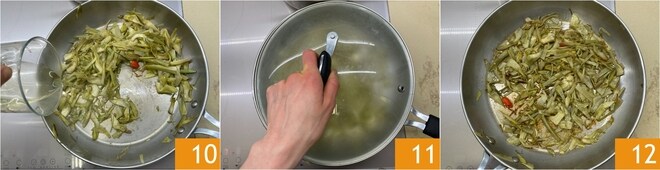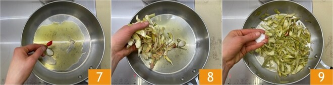 Aqueça em uma panela um fio de óleo junto com um dente de alho e a pimenta 7, depois adicione as alcachofras escorridas 8, salgue 9 e refogue em fogo médio por alguns minutos.