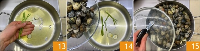 Enquanto as alcachofras cozinham, cuide dos vôngoles: em outra panela, tempere um fio de óleo com um dente de alho e os talos de salsa 13, depois adicione os vôngoles escorridos da água de imersão 14. Cubra com a tampa 15 e cozinhe em fogo alto apenas o tempo suficiente para abrir as conchas.