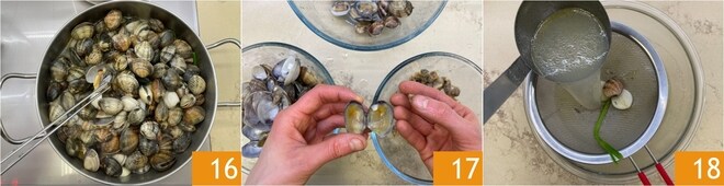 À medida que forem abrindo, remova os vôngoles da panela 16. Retire a casca de quase todos os moluscos, deixando alguns inteiros para a decoração 17. Filtre o líquido de cozimento dos vôngoles 18 e reserve.