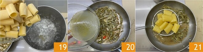 Enquanto isso, leve uma panela de água salgada para ferver e cozinhe os paccheri al dente 19. Despeje o líquido de cozimento dos vôngoles na panela com as alcachofras 20, depois escorra aqui também os paccheri 21. Misture e termine de cozinhar a massa, adicionando, se necessário, um pouco de água de cozimento.