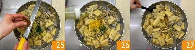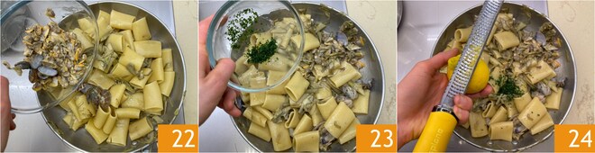 Por último, adicione os vôngoles sem as cascas 22 e salteie tudo novamente. Desligue o fogo e aromatize com a salsa picada 23 e a casca de limão ralada 24.