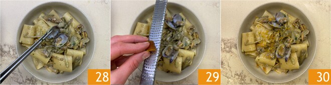 Emprate e decore com os vôngoles inteiros reservados 28, depois complete com mais um pouco de bottarga ralada 29. Os seus paccheri com alcachofras, vôngoles e bottarga estão prontos para serem servidos 30!