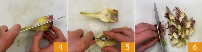 Divida as alcachofras ao meio no sentido do comprimento 4, depois remova os pelos 5 e corte-as em fatias finas 6. Mergulhe as alcachofras limpas em uma tigela com água acidulada, para evitar que escureçam.