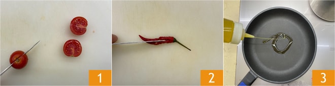 Para preparar os paccheri com anchovas e tomatinhos, corte os tomatinhos ao meio 2, faça um corte e divida ao meio também a pimenta 2. Em uma frigideira, coloque um fio de azeite extra virgem 3.