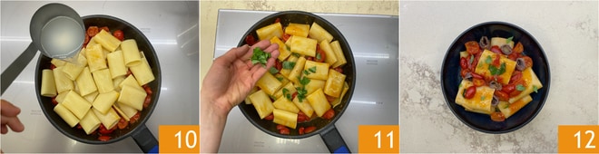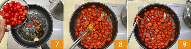 Assim que as anchovas estiverem derretidas, adicione os tomatinhos 7, cozinhe por 10 minutos, em seguida, retire o alho 8 e a pimenta 9.