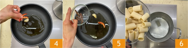 Tempere com alho, pimenta 4 e anchovas 5; derreta suavemente as anchovas. Enquanto isso, cozinhe os paccheri em água fervente com sal 6.