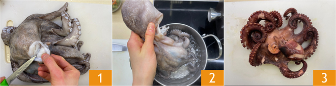 Para preparar os paccheri com polvo e batatas, primeiro limpe o polvo eliminando os olhos e o bico 1. Mergulhe os tentáculos do polvo na água fervente por 2 a 3 vezes para enrolá-los 2, depois deixe cozinhar por cerca de 40 a 50 minutos. Após esse tempo, verifique se a carne está macia inserindo uma faca entre a cabeça e os tentáculos, depois escorra e deixe esfriar em uma tábua de corte 3.