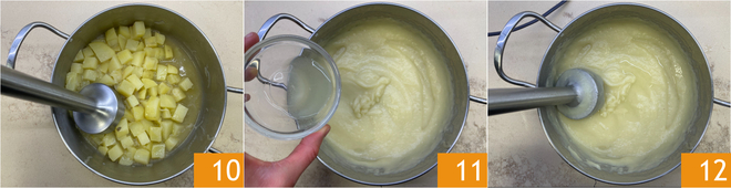 Bata com um mixer de imersão 10 para obter um creme liso e homogêneo, em seguida ajuste o sal. Adicione o suco de limão 11 e bata novamente para misturar 12; se necessário, você pode diluir ainda mais com um pouco de água. Reserve.